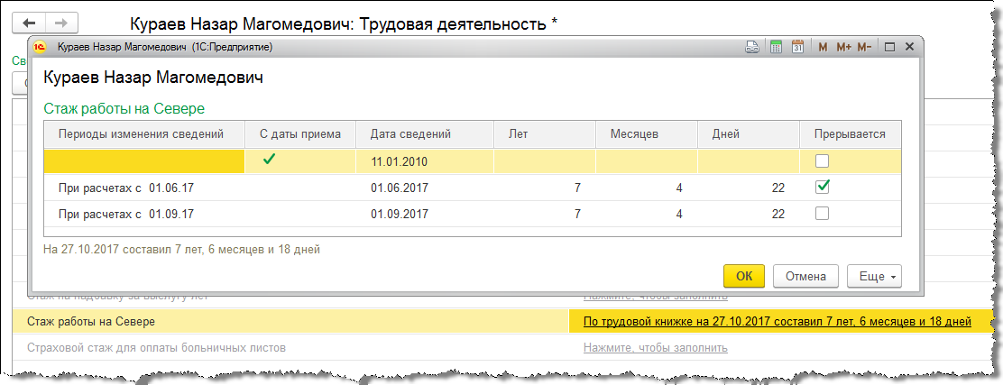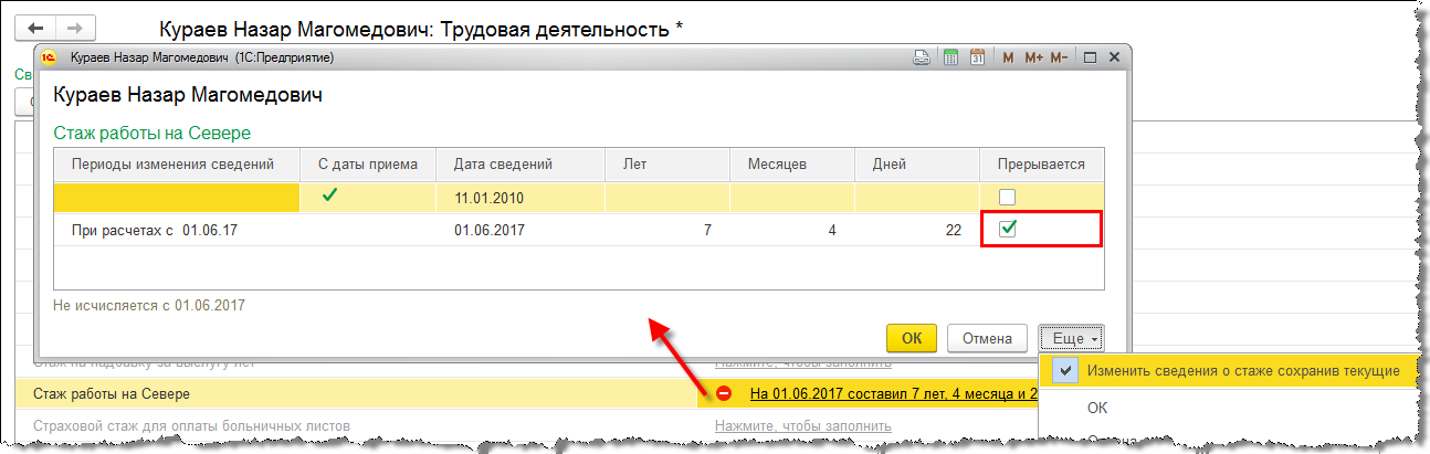 Тогда в описанном выше примере для прерывания северного стажа достаточно будет оформить кадровый перевод сотрудника из "северного" подразделения в обычное, и это будет автоматически учтено при подсчете стажа. Прерывать стаж вручную не потребуется.