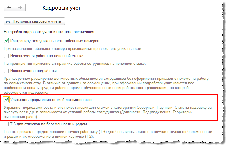Также реализована возможность автоматического учета прерывания некоторых видов стажа. Она располагается в настройках кадрового учета – "Учитывать прерывание стажей автоматически".
