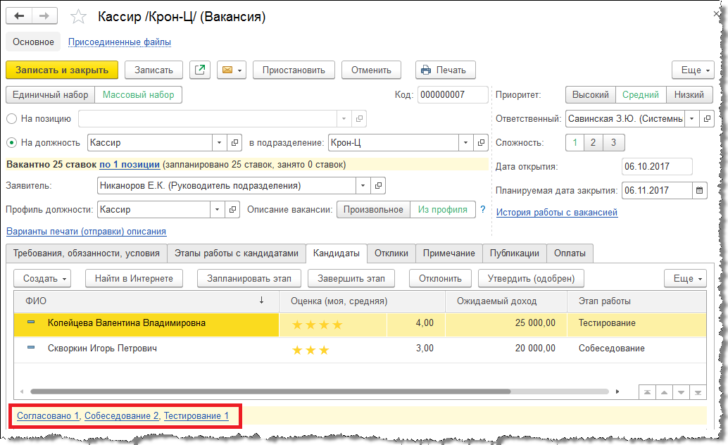 В карточке вакансии на вкладке Кандидаты можно увидеть количество согласованных кандидатов, а также количество кандидатов, проходящих различные этапы работы с кандидатами.