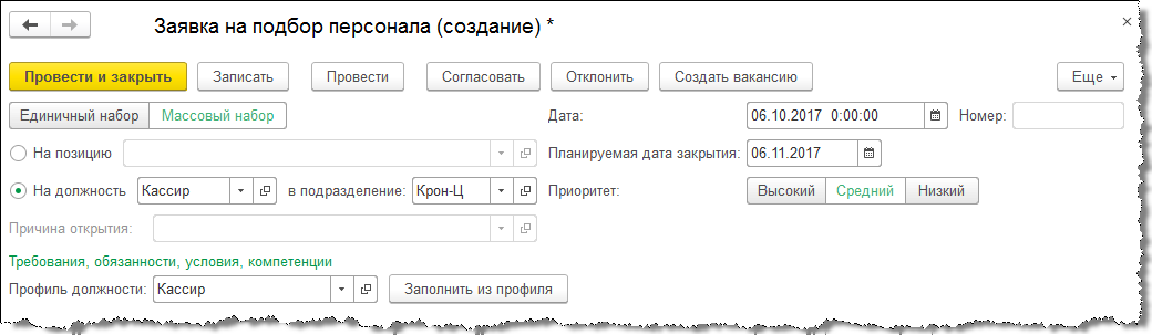 В рамках массового набора вакансия может быть также открыта на указанную должность без указания подразделения для рассмотрения на одну вакансию большого потока кандидатов, к которым предъявляются однотипные требования.