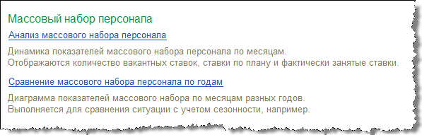 В разделе Подбор персонала – Отчеты по подбору персонала можно перейти к специализированным отчетам, характеризующим необходимость массового набора персонала и его успешность.