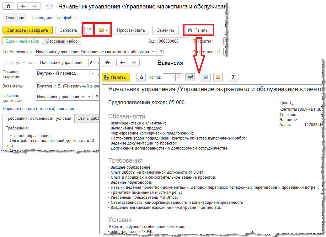 В версии 3.1.4 стало возможным отправлять ссылки на вакансию для ее просмотра, отправлять описание вакансии по электронной почте, а также добавлена печатная форма вакансии.