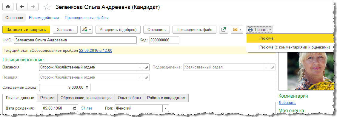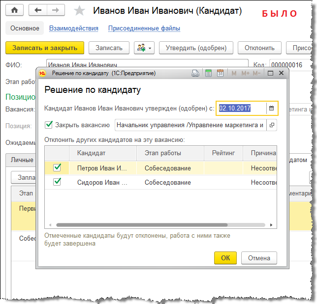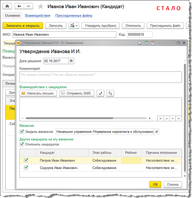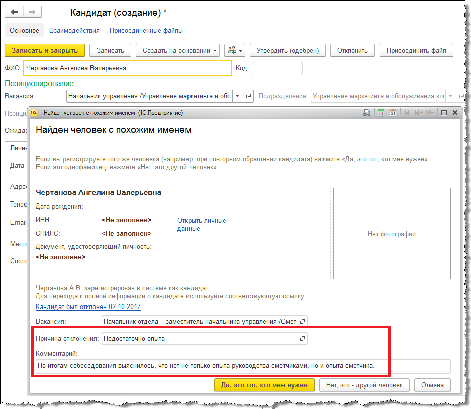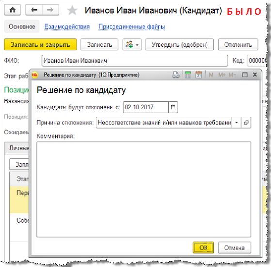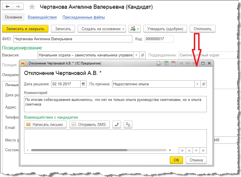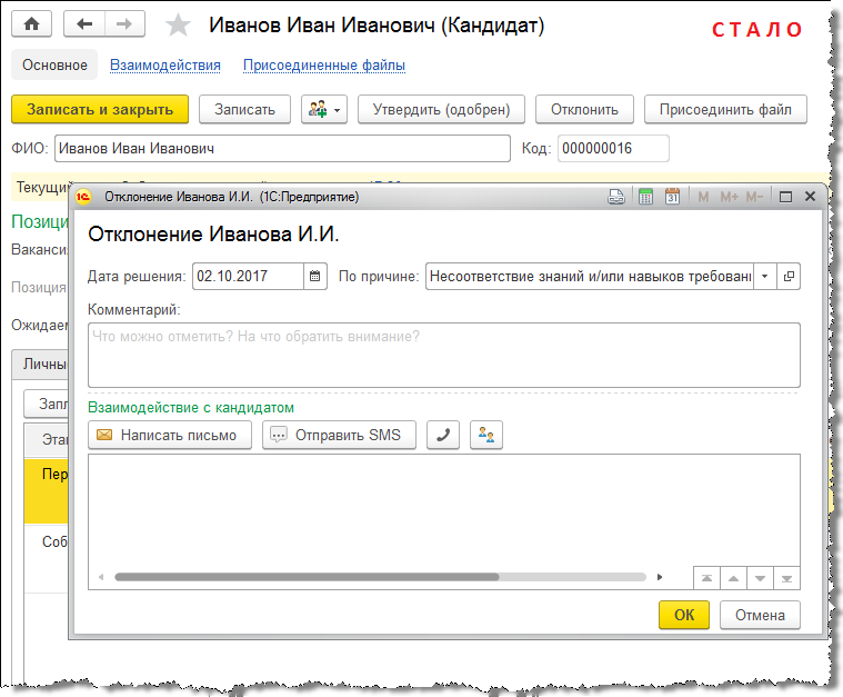 Аналогичные комментарии можно регистрировать при отклонении кандидата.