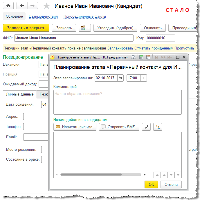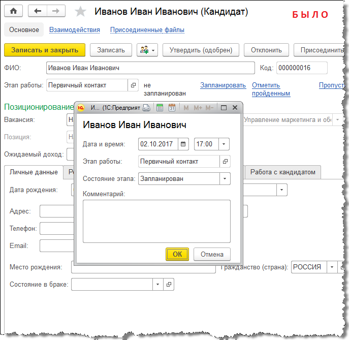 В дальнейшем при попытке создать нового кандидата такой комментарий также будет показан пользователю.