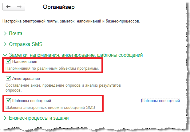 В разделе Администрирование – Органайзер появились настройки, определяющие использование напоминаний и шаблонов сообщений.