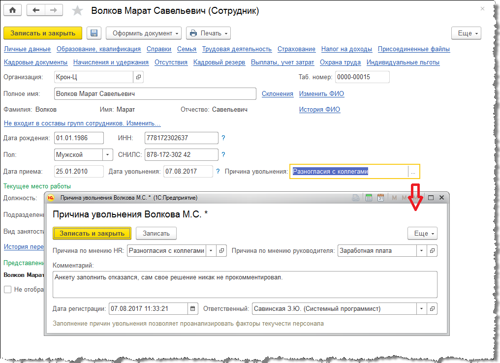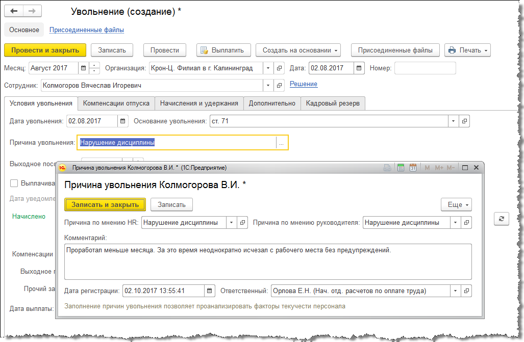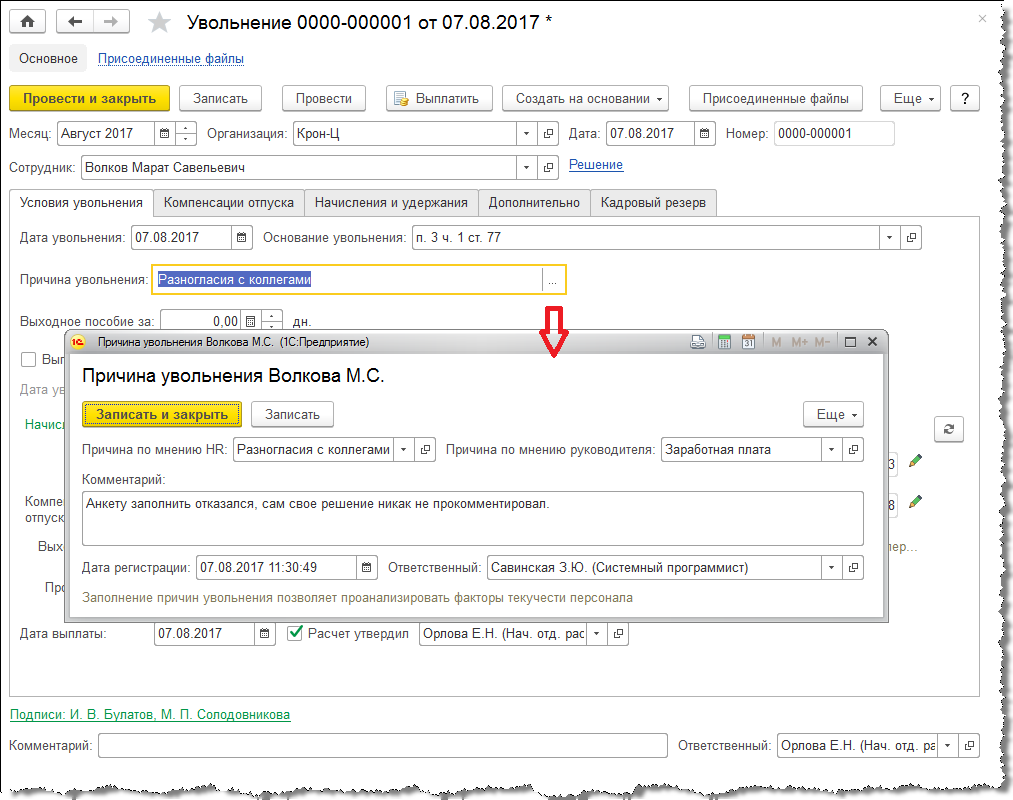 Например, при увольнении сотрудника указывается причина увольнения и комментарий.