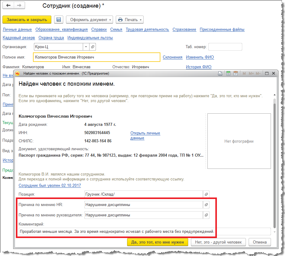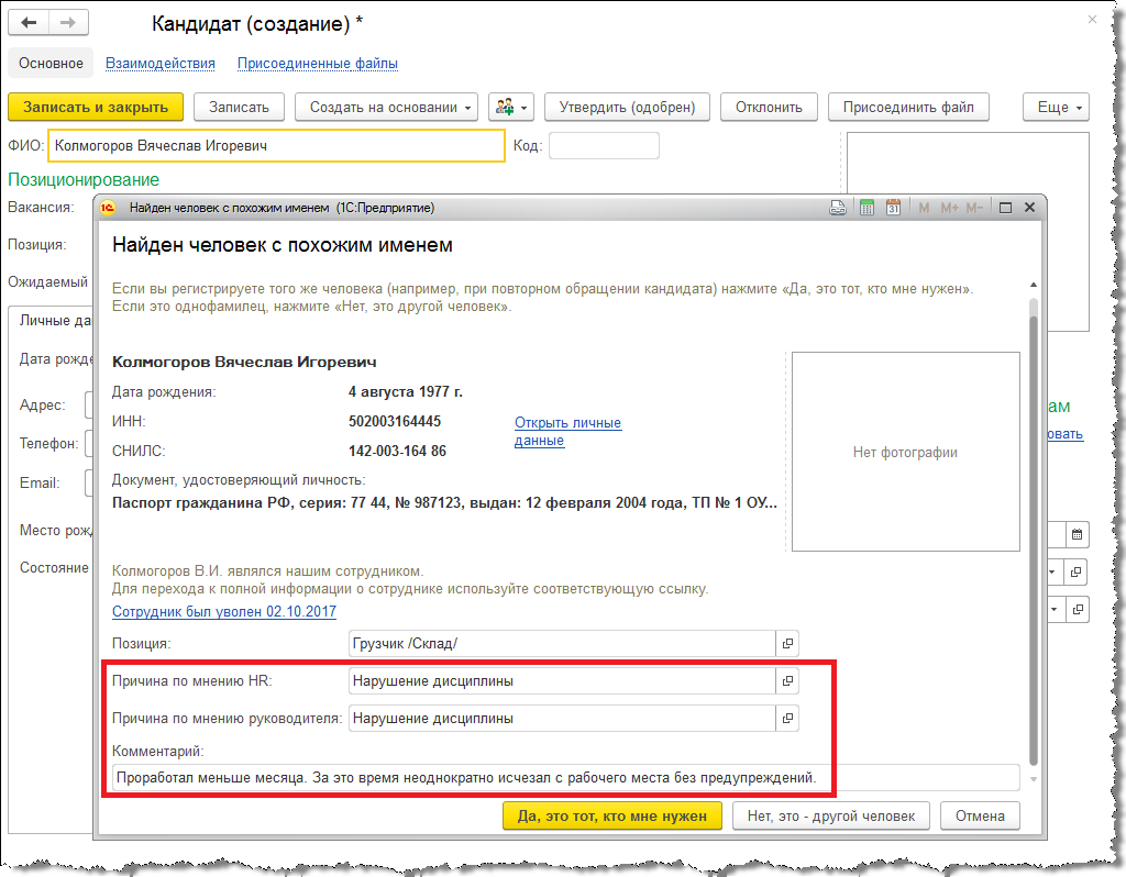 В дальнейшем при попытке создания нового кандидата пользователь сможет увидеть, что этот же человек уже работал в организации и был уволен. При этом будут показаны причина увольнения и комментарий.