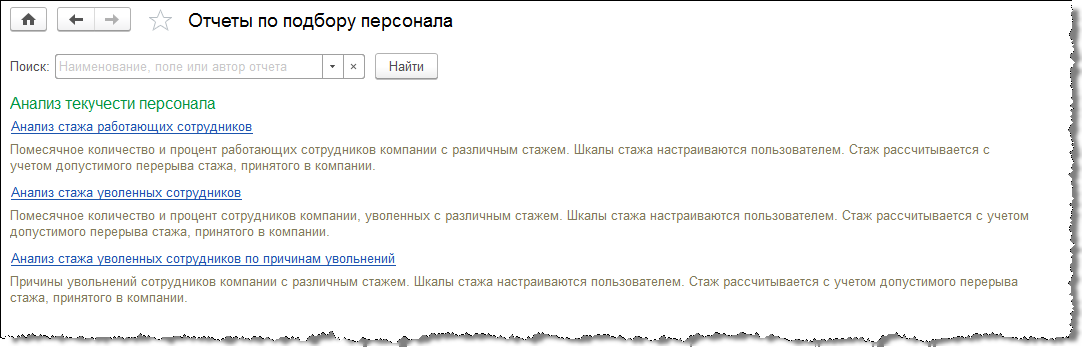 В разделе Подбор персонала – Отчеты по подбору персонала добавлены специализированные отчеты, характеризующие продолжительность работы сотрудников, продолжительность работы уволенных сотрудников, а также причины увольнений сотрудников.