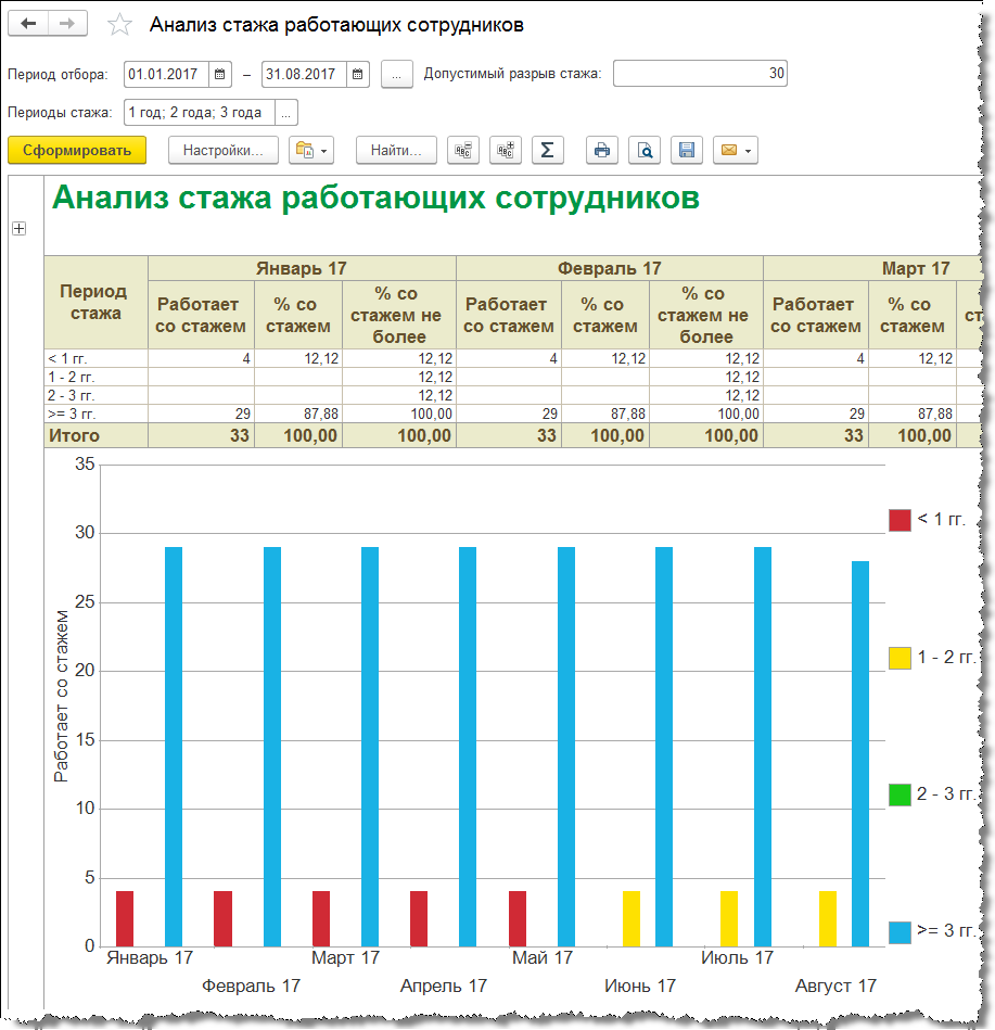 В отчетах в поле Допустимый разрыв стажа возможно указать продолжительность периода, в течение которого сотрудник условно при формировании текущего отчета не считается уволенным и вновь принятым.