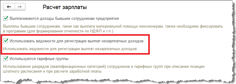 Помимо этого в настройках расчета зарплаты может быть включена возможность выплаты доходов, рассчитанных документами Дивиденды, Выплата бывшим сотрудникам и Начисление прочих доходов по ведомостям.