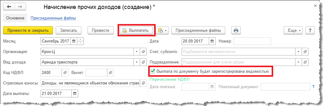 При использовании этой возможности в перечисленных документах появляется флажок Выплата по документу будет зарегистрирована ведомостью. При включении этого флажка становится доступной кнопка Выплатить, с помощью которой можно создать ведомость на выплату.