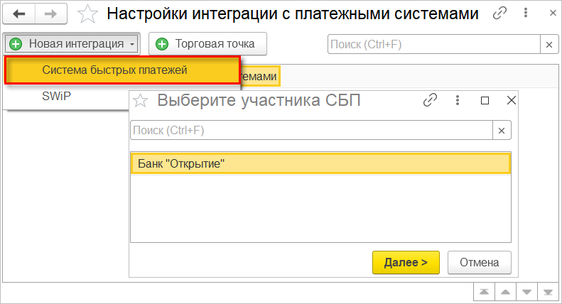 Если в программе настроено несколько интеграций с банками, то при нажатии на кнопку СБП пользователю потребуется выбрать конкретную.