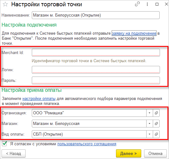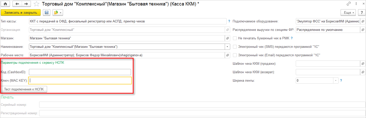 Каждая Касса ККМ имеет свои собственные реквизиты подключения к НСПК (которые необходимо заполнить):