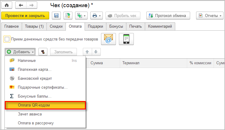 В случае, если возврат выполняется не на основании документа продажи «1С:Розницы», необходимо отсканировать идентификатор продажи из бумажного чека в поле QR-код оплаты.