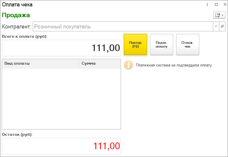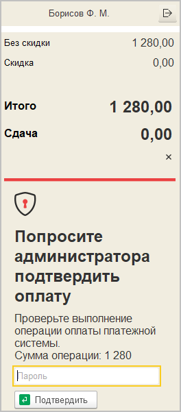 Но если у пользователя (например, старшего кассира или администратора) установлено дополнительное право Разрешить оплату / возврат без подтверждения от платежной системы, то он может подтвердить оплату. То есть, если он уверен, что оплата прошла (несмотря на предупреждение сервиса), то с помощью кнопки Подтв. оплату можно завершить оформление продажи.