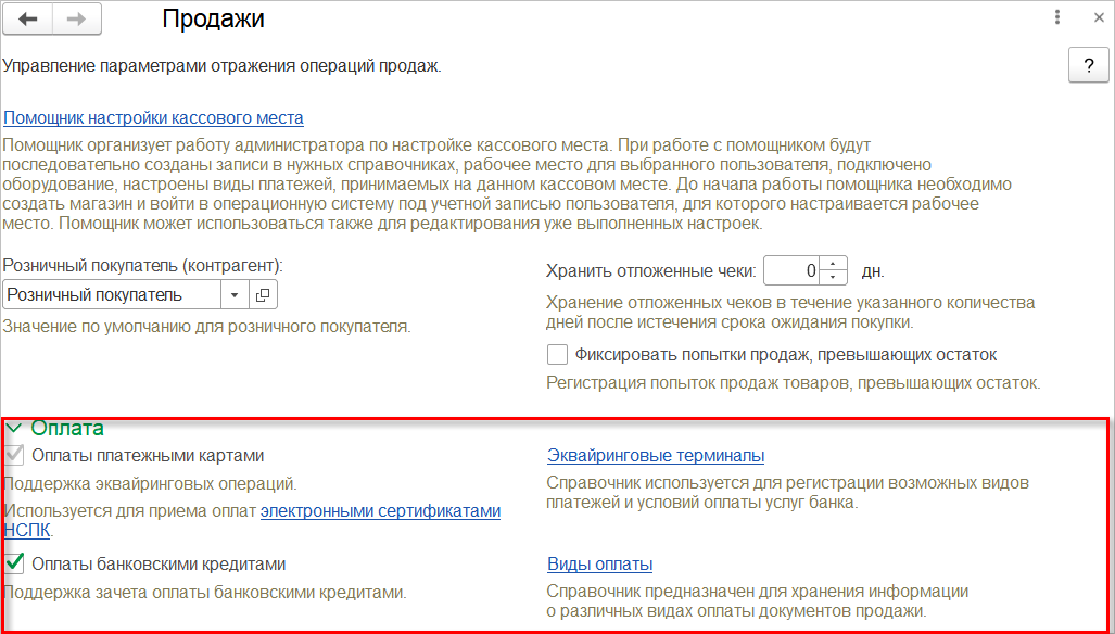 Оплата электронными сертификатами НСПК возможна только с использованием платежных карт МИР. Поэтому при включении учета товаров ФСС дополнительно необходимо включить и опцию Оплата платежными картами.