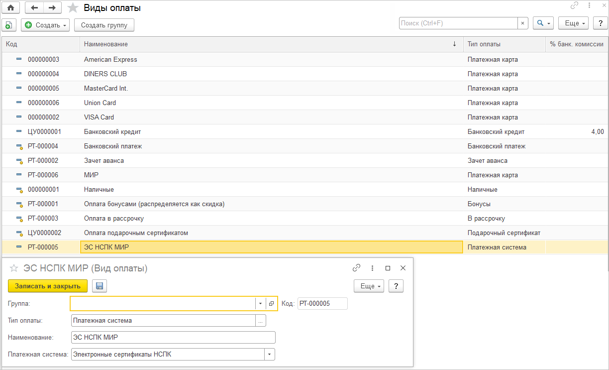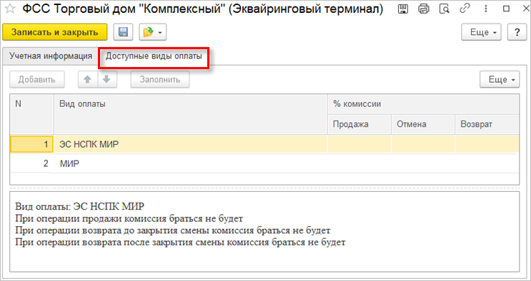 Завершить настройку оборудования следует после добавления в доступные виды оплат на терминале ранее созданных элементов с типом Платежная система и Платежная карта.