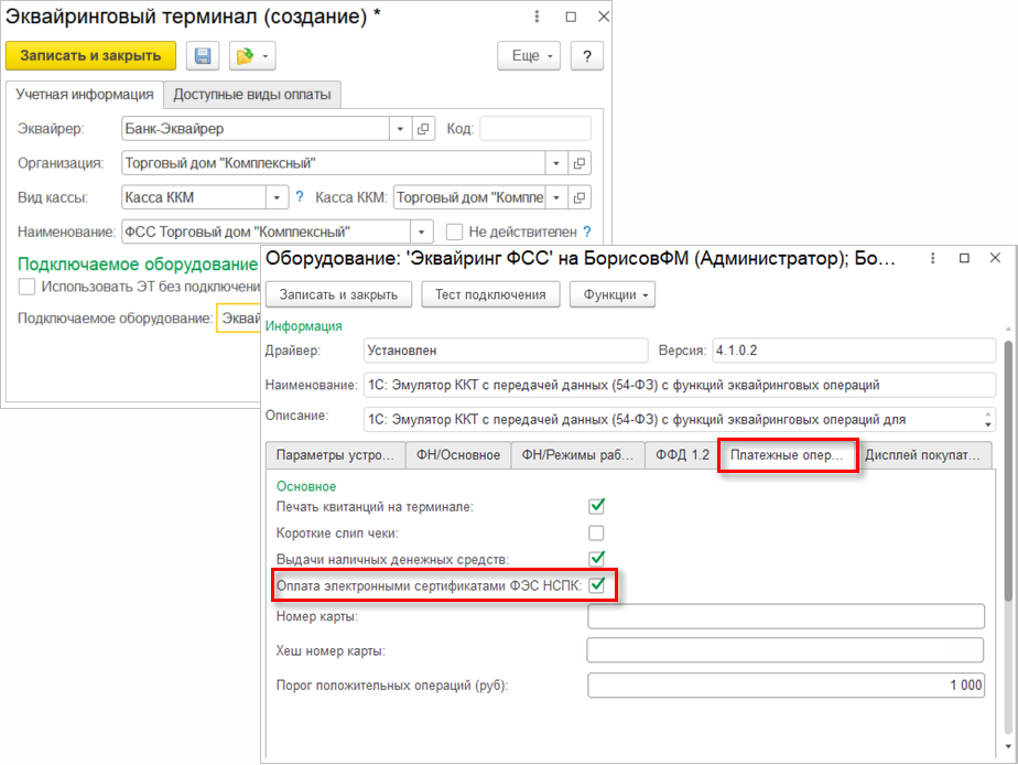 А в карточке эквайрингового терминала нужно выбрать кассу ККМ, настроенную для работы с НСПК. Также необходимо выбрать экземпляр подключаемого оборудования, в настройках которого включена возможность оплаты электронными сертификатами НСПК.