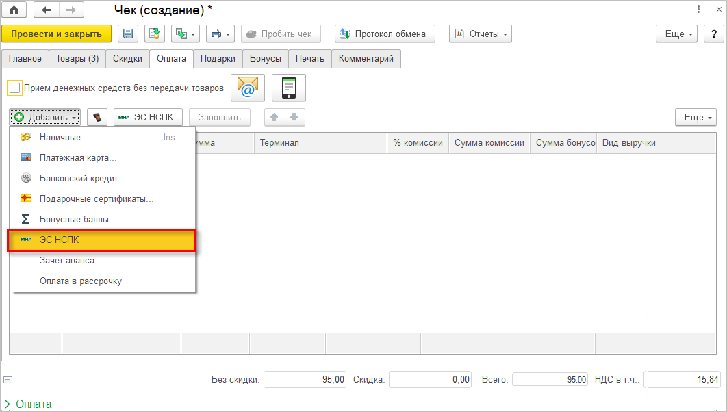Также имеется возможность отложить чек на время исправления ошибки оплаты (с помощью кнопки Отлож. чек). Например, если действительно произошел сбой или покупатель, обнаружив, что остатка денежных средств недостаточно, отошел пополнить счет, не задерживая очередь. То после исправления сбоя/возвращения покупателя можно открыть отложенный чек и продолжить оформление оплаты.