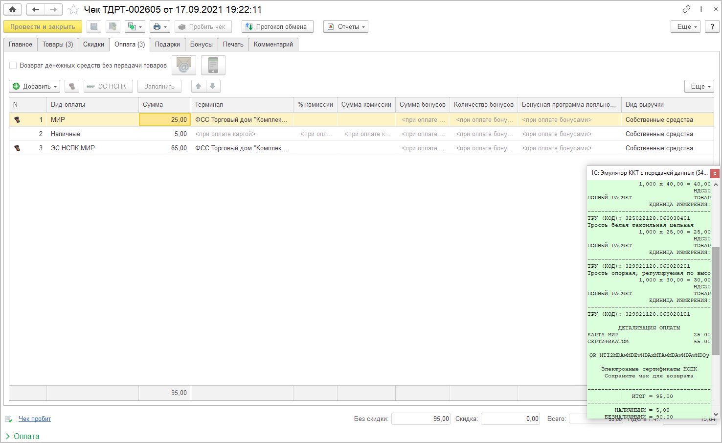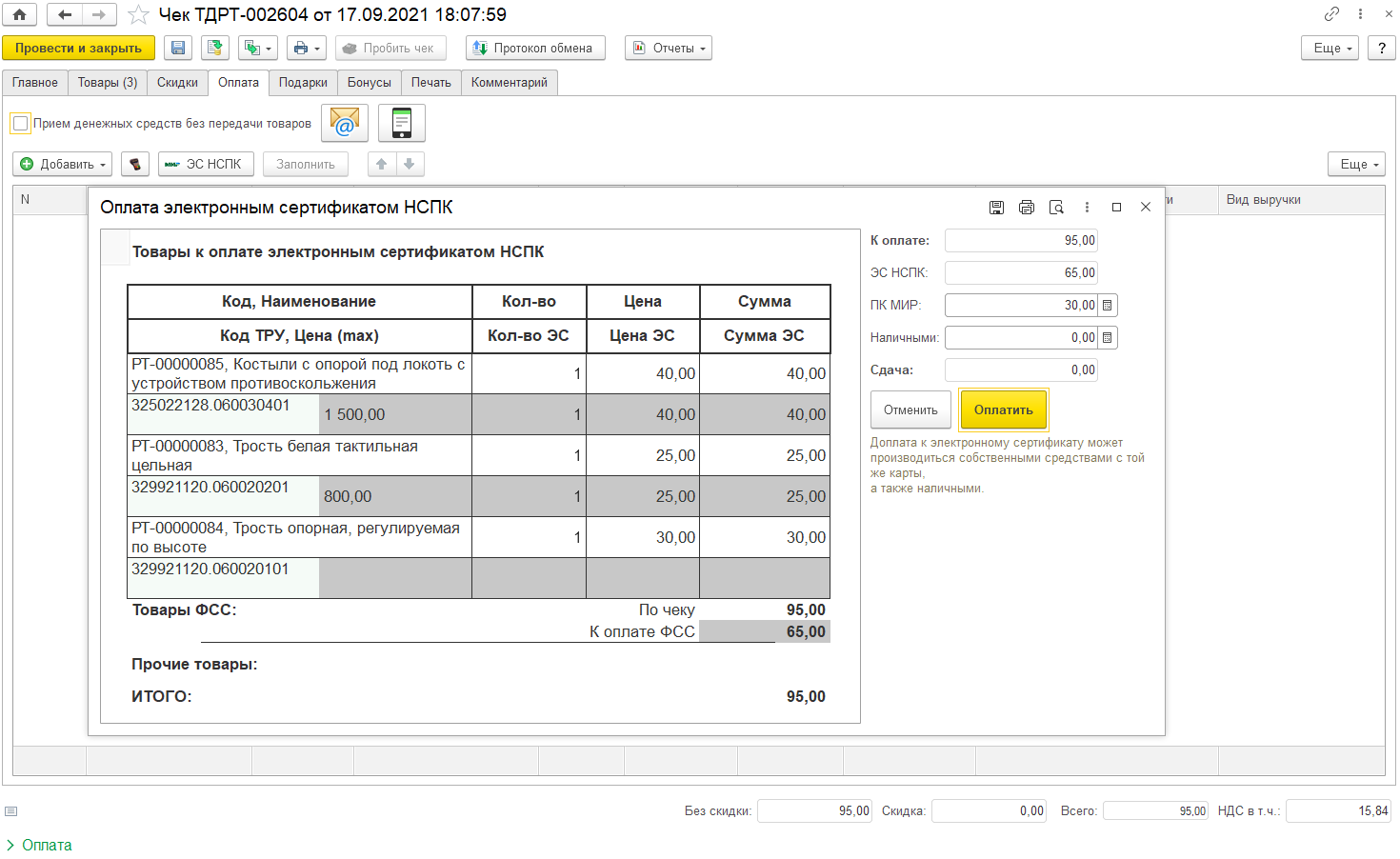 Система выполняет запрос по идентификатору прошлой покупки к НСПК, а в ответ получает слепок корзины товаров, оплаченных только за счет сертификата. При фискализации чека также печатаются коды ТРУ у товаров, выделяется сумма оплаты электронным сертификатом, картой МИР.