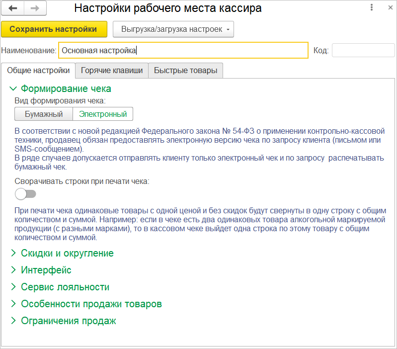 Все настройки распределены в функциональные группы, раскрывая которые пользователь сможет достаточно гибко настроить свое рабочее место, учитывая все особенности работы магазина. На отдельных страницах можно указать горячие клавиши и быстрые товары.
