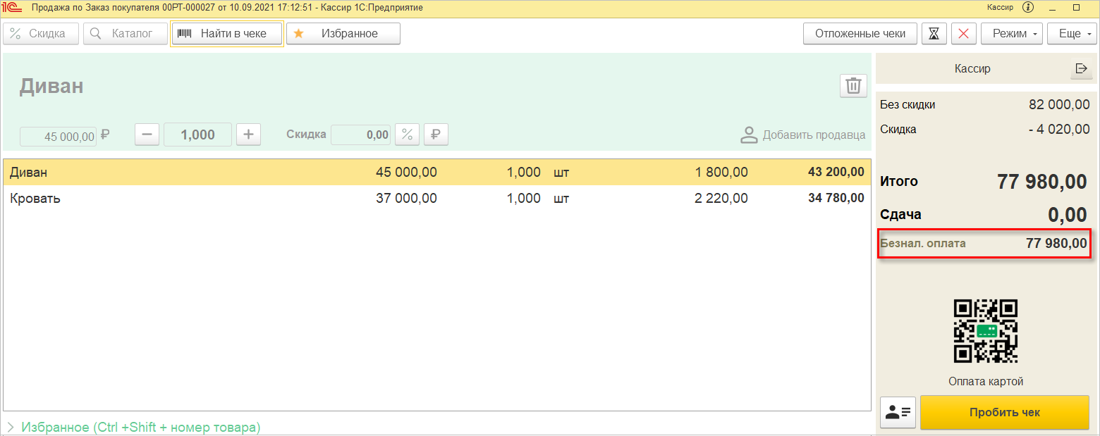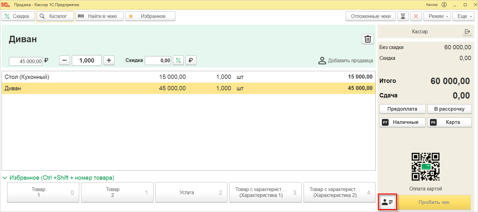 После добавления товаров у кассира «перед глазами» отобразится вся необходимая информация: данные по текущей строке, итоги с суммами чека, видами оплат, команда пробития чека и данные покупателя.