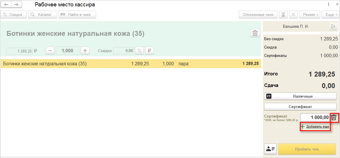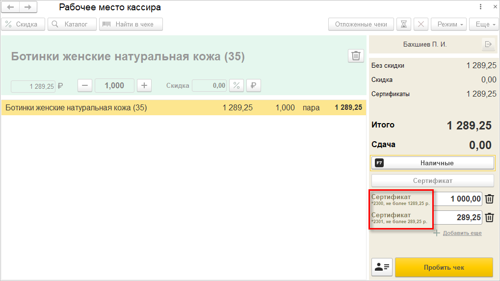 В новом РМК предусмотрена и оплата подарочными сертификатами, которые можно вводить вручную или считывать сканером. Кассир всегда видит оставшуюся сумму по сертификату на экране и при необходимости может оформить сложную оплату.