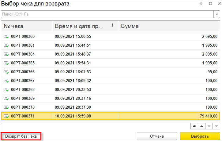 Для оформления возврата от покупателя предусмотрен специальный режим Возврат продажи. Здесь можно указать документ продажи или оформить возврат без чека.