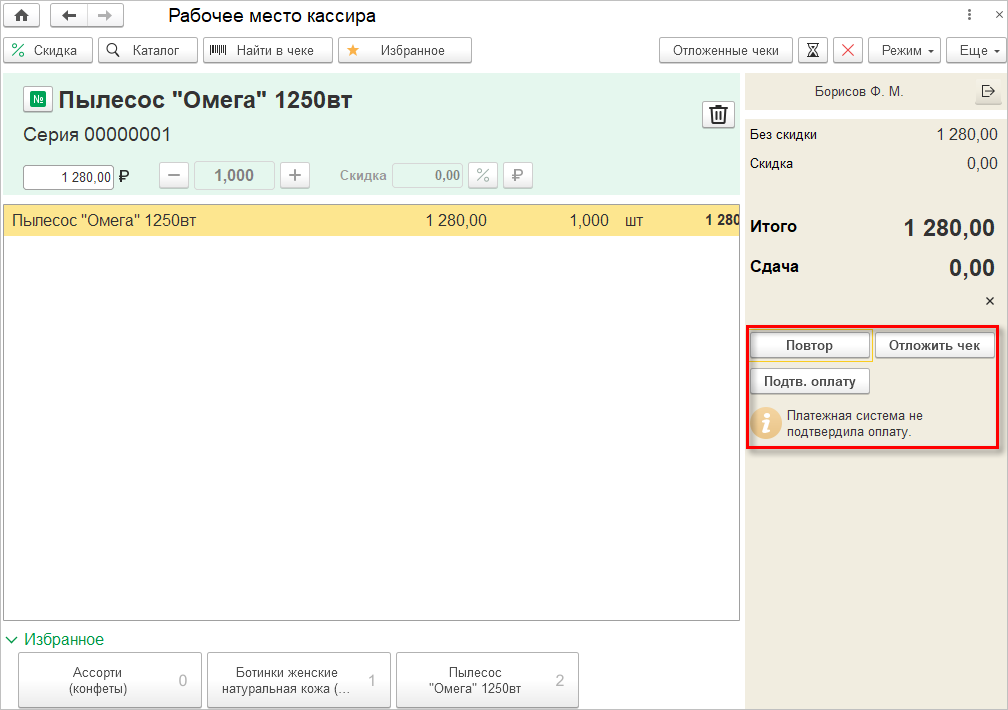 Но, например, если покупатель не успел оплатить покупку, то кассир может продлить время ожидания еще на минуту. Также можно отложить чек или подтвердить оплату (если пользователь имеет на это дополнительное право).