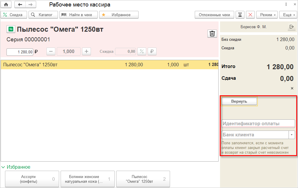 Возврат от покупателя оформляется стандартным чеком возврата. Если оплата осуществлялась с помощью платежной системы, то возврат можно оформить только с её помощью. Допускаются случаи возврата не на основании документа продажи «1С:Розницы» - потребуется отсканировать идентификатор продажи из бумажного чека.