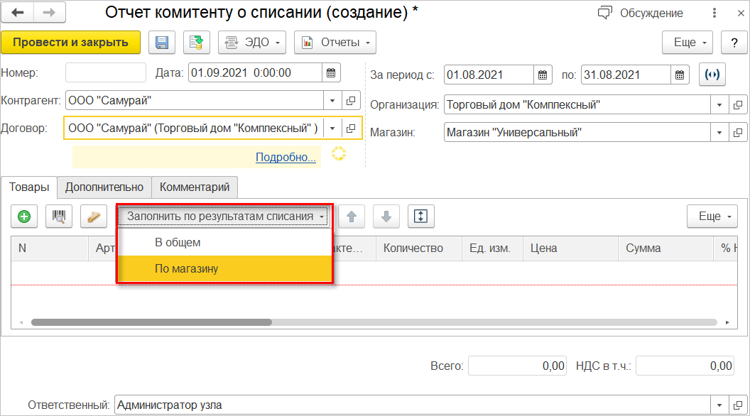 В документах Отчет комитенту о продажах и Отчет комитенту о списании появилась возможность выбрать, какими результатами заполнять табличную часть Товары: