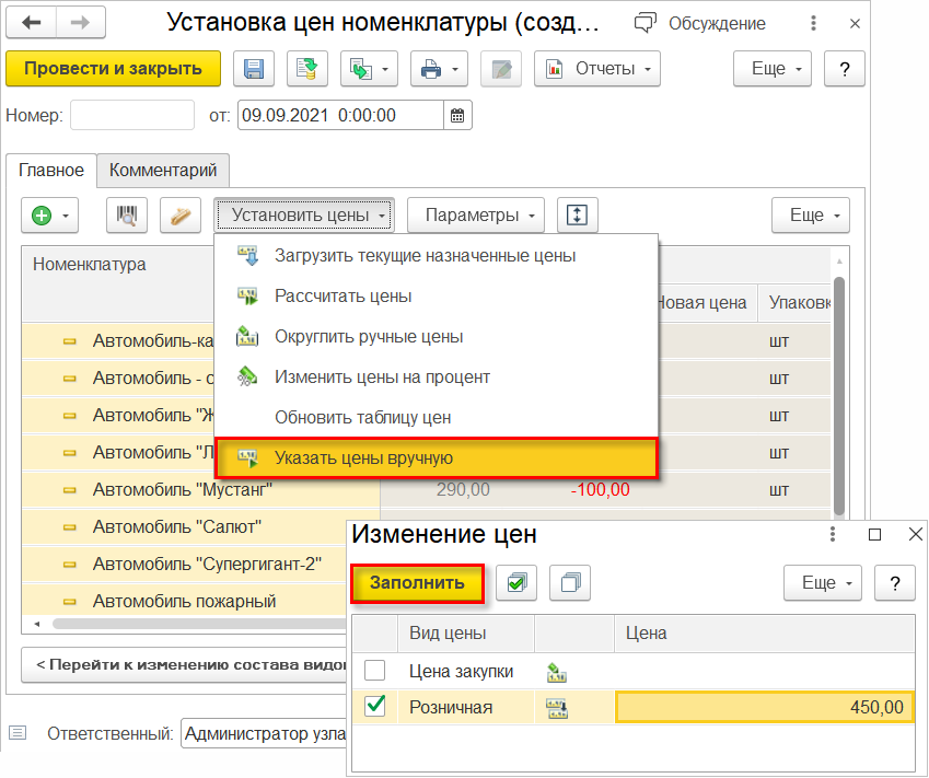 Для этого в подменю Установить цены была добавлена команда Указать цены вручную. В открывшейся форме необходимо указать новую цену для требуемого вида цен и нажать кнопку Заполнить. Выделенным строкам будет присвоена новая цена.
