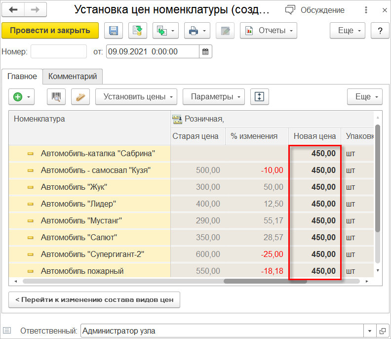В связи с этим в документе Установка цен номенклатуры появилась возможность указать вручную одну цену сразу для нескольких строк номенклатуры.