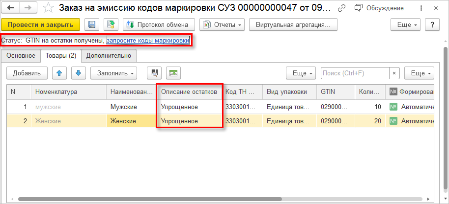 В документе Заказ на эмиссию кодов маркировки ИС МП в табличной части Товары для духов и туалетной воды можно выбрать режим упрощенного описания остатков. При этом указывать конкретную номенклатуру не требуется. Для каждой группы товаров нужно указать Код ТНВЭД, после чего с помощью специальной ссылки запросить GTIN на остатки для каждой из них. Все коды остатков начинаются с «029….». Затем необходимо запросить коды маркировки с помощью одноименной ссылки и после ответа ГИС МТ перейти к печати этикеток с помощью команды Печать.
