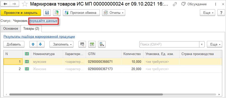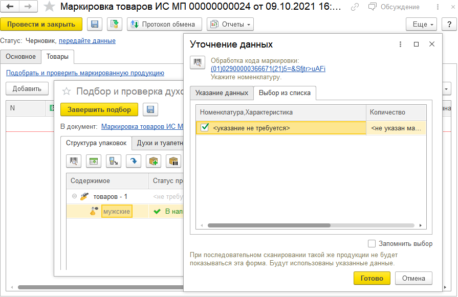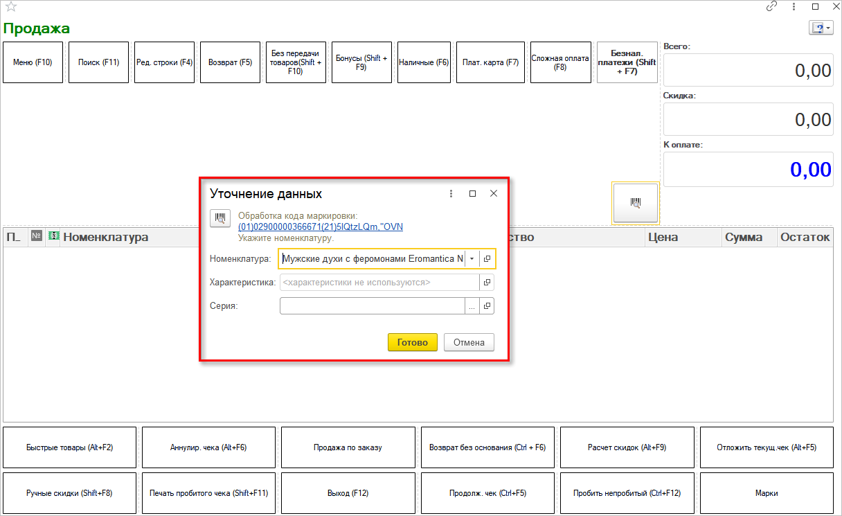 Если на этапе ввода в оборот не была произведена «привязка» кода к конкретной номенклатуре, то уточнить данные потребуется на этапе продажи.