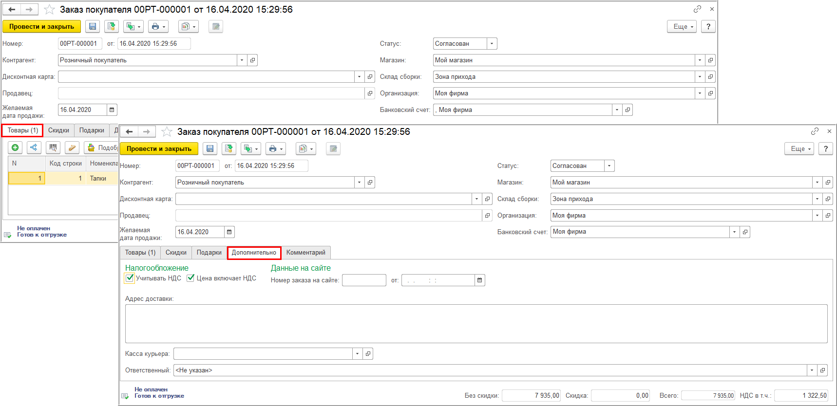 В новой карточке документа реквизиты документа собраны на вкладке Основное. Здесь же теперь расположены реквизиты Касса курьера и Ответственный, группы Налогообложение и Данные на сайте, которые ранее относились к вкладке Дополнительно.