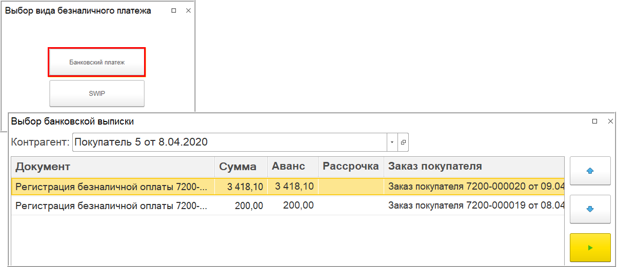 В форму выбора банковской выписки попадают введенные на основании «Заказов покупателей» документы вида Регистрация безналичной оплаты.