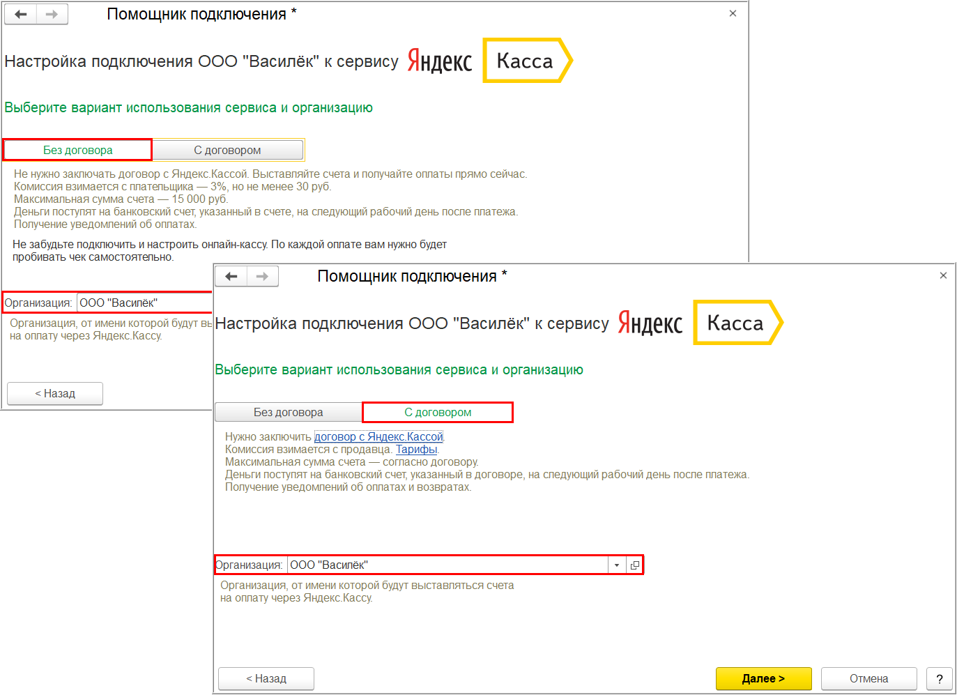 В процессе настройки нужно выбрать «Организацию» и указать, каким образом будет подключена «Яндекс.Касса» - с использованием договора или без. От этого будет зависеть дальнейшее поведение помощника.