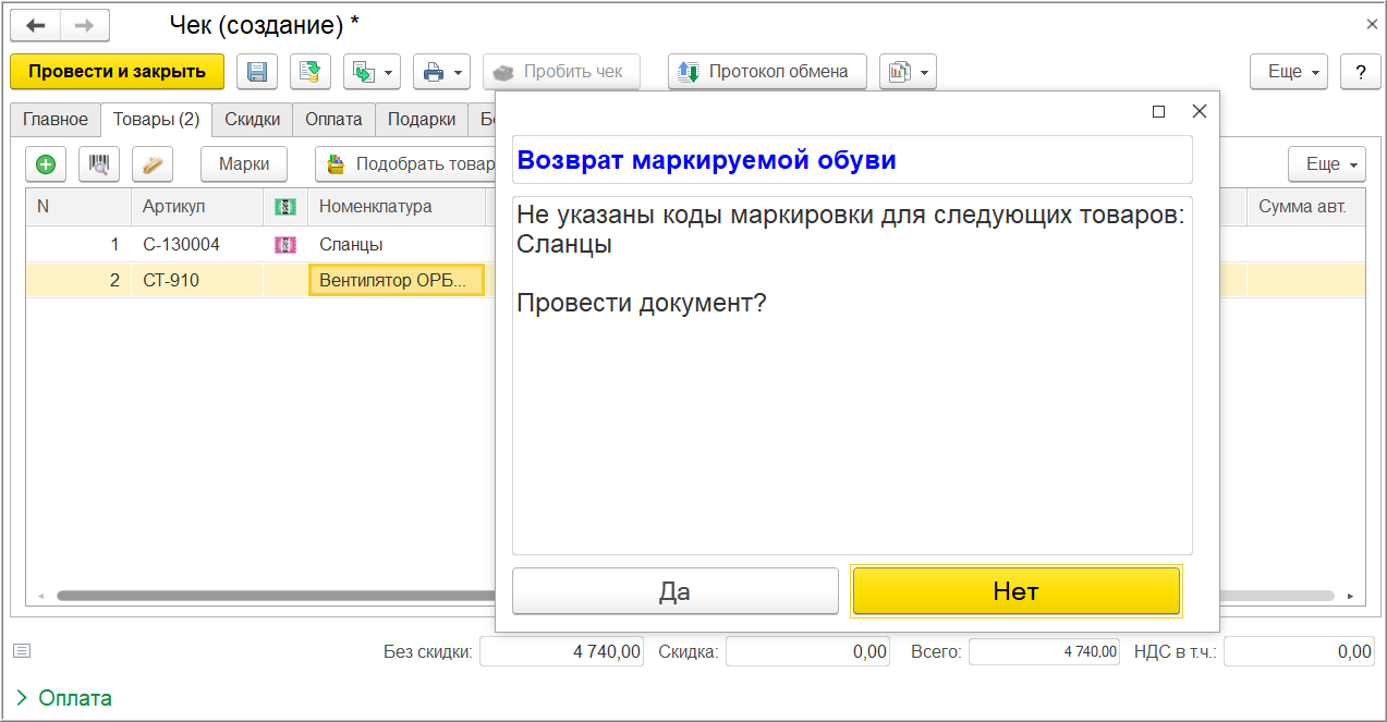 Пользователь может оформить и пробить чек на возврат обувной продукции без указания кода маркировки, если подтвердит свои намерения.