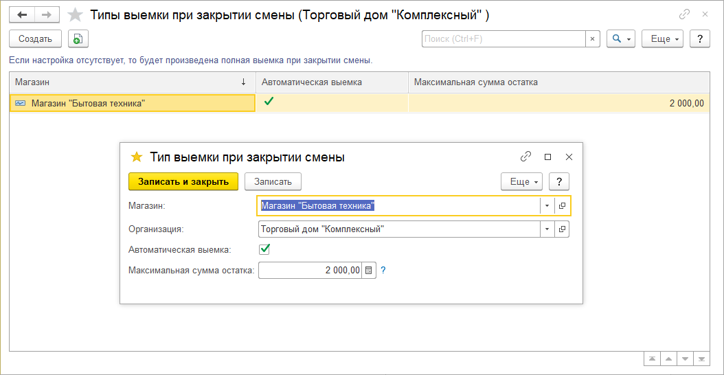 Настройка способа выемки устанавливается для каждой организации и магазина отдельно. К списку Типы выемки при закрытии смены можно перейти как из карточки магазина, так и из карточки организации.