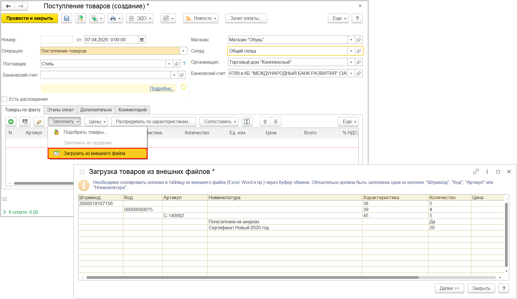 Для этого необходимо выполнить команду Загрузить из внешнего файла. В документе Заказ поставщику она запускается