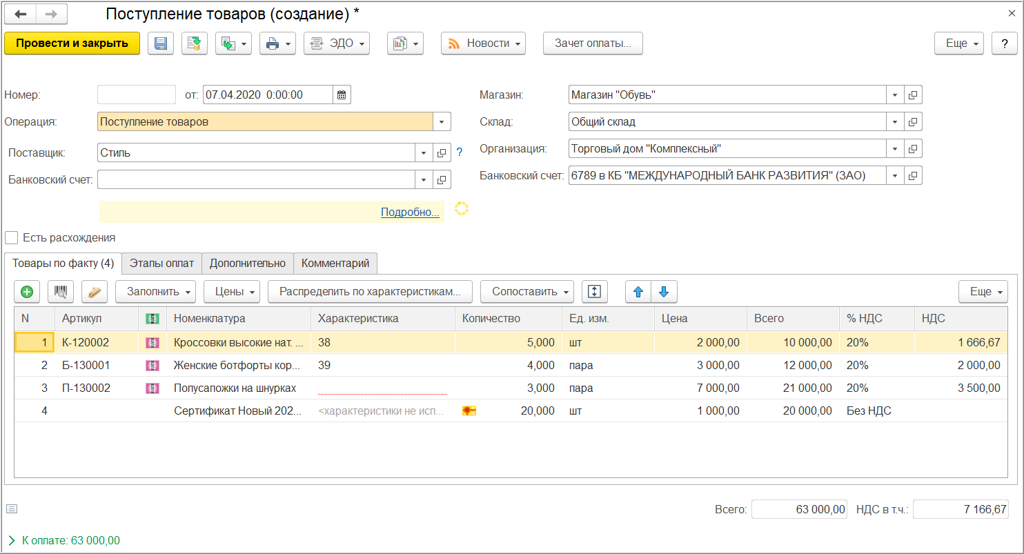 Для документа Поступление товаров поддержана загрузка маркируемого товара и подарочных сертификатов. После проверки корректности данных документ можно провести.