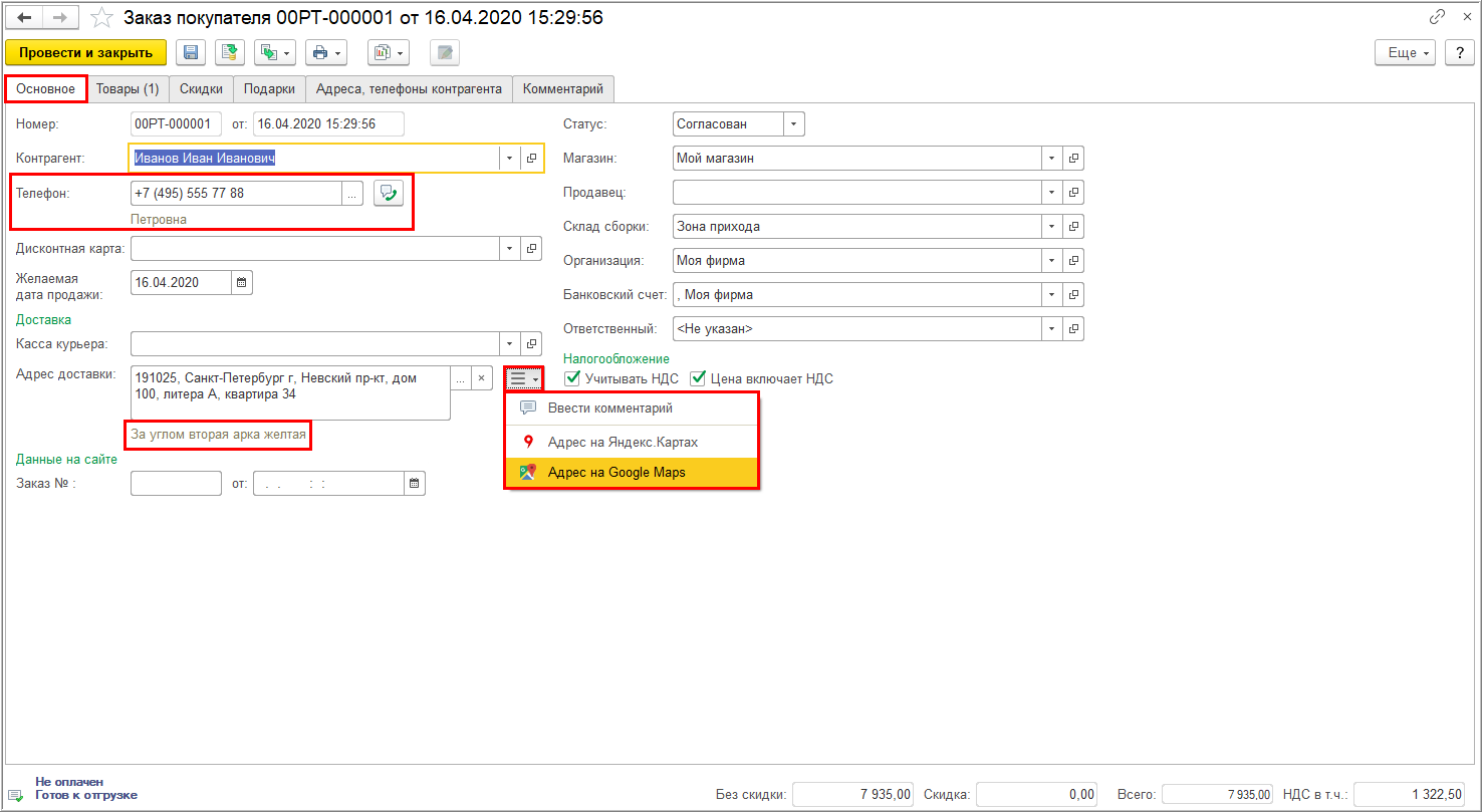 В старой карточке документа информация о контактах (в том числе телефонных) отсутствовала, многие реквизиты были скрыты по вкладкам. Адрес доставки был представлен в виде поля со значениями в свободной форме, без формализации в соответствии с адресным классификатором. Причем, при смене контрагента адрес оставался прежним.