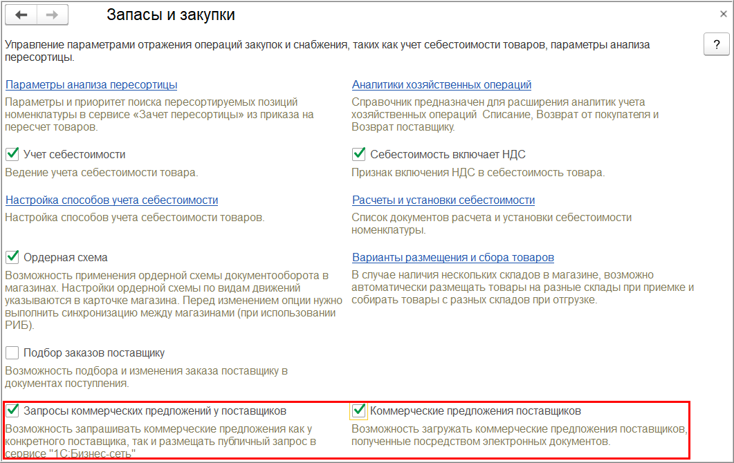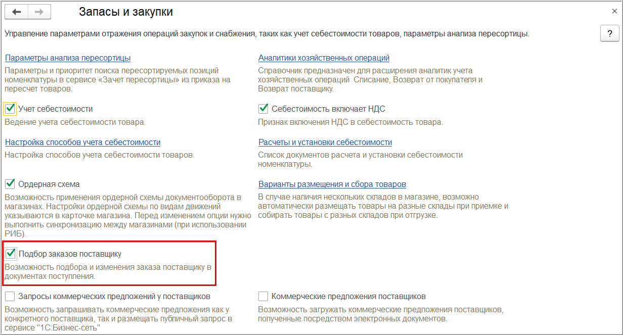 Для этого необходимо перейти в раздел Администрирование – Запасы и закупки и включить опцию Подбор заказов поставщику.