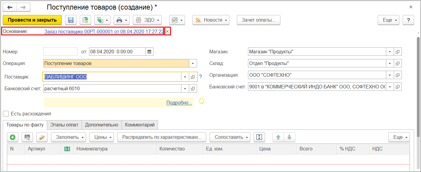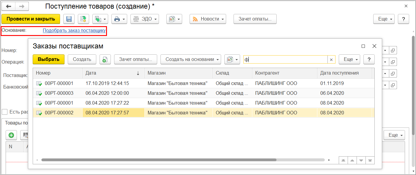 Если при записи документа Поступление товаров на конкретную дату у контрагента уже имеется один незакрытый документ Заказ поставщику с соответствующей датой поставки, то он подставится автоматически в реквизит Основание.