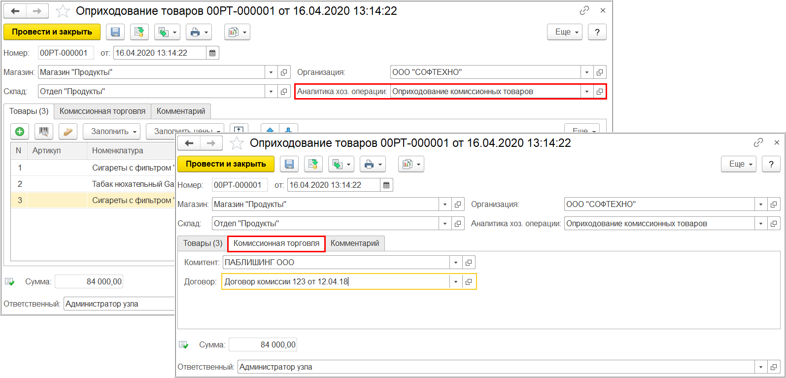С помощью документа Оприходование товаров можно оформлять операцию оприходования комиссионного товара, в том числе маркированного. Для этого в поле Аналитика хоз. операции нужно указать значение Оприходование комиссионных товаров. После чего появится новая вкладка Комиссионная торговля, на которой необходимо заполнить следующие реквизиты: