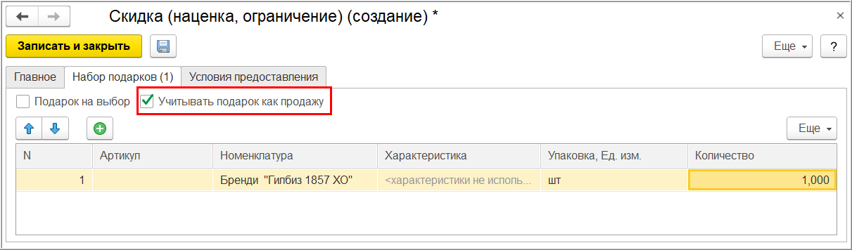 Сценарий 1. Если подарок учитывать как продажу (в элементе справочника Скидки (наценки ограничения) установлен соответствующий признак), то можно использовать следующие виды продукции: