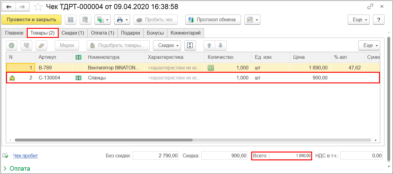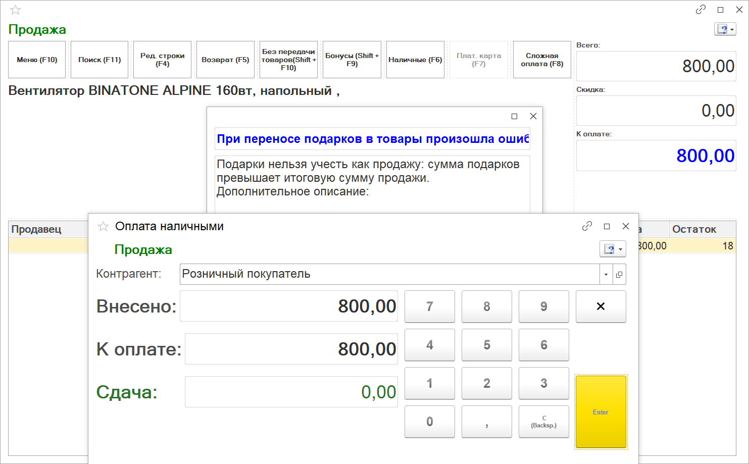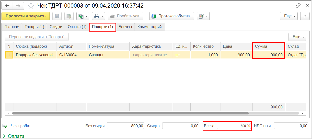 При этом могут возникнуть различные исключительные ситуации, когда подарок невозможно перенести в ТЧ Товары. Например, по причине того, что сумма подарка выше итоговой суммы товаров чека.