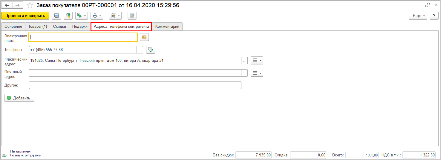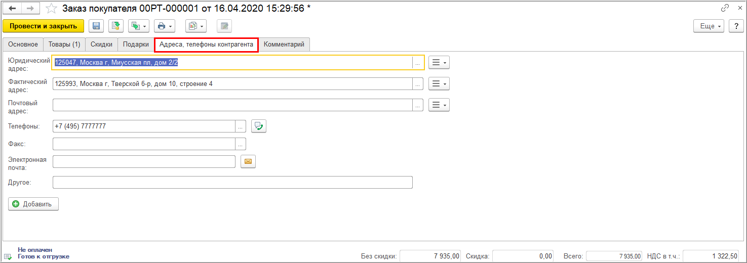 При сохранении «Заказа покупателя» все внесенные на данной вкладке изменения будут сохранены в контактной информации соответствующей карточки контрагента.