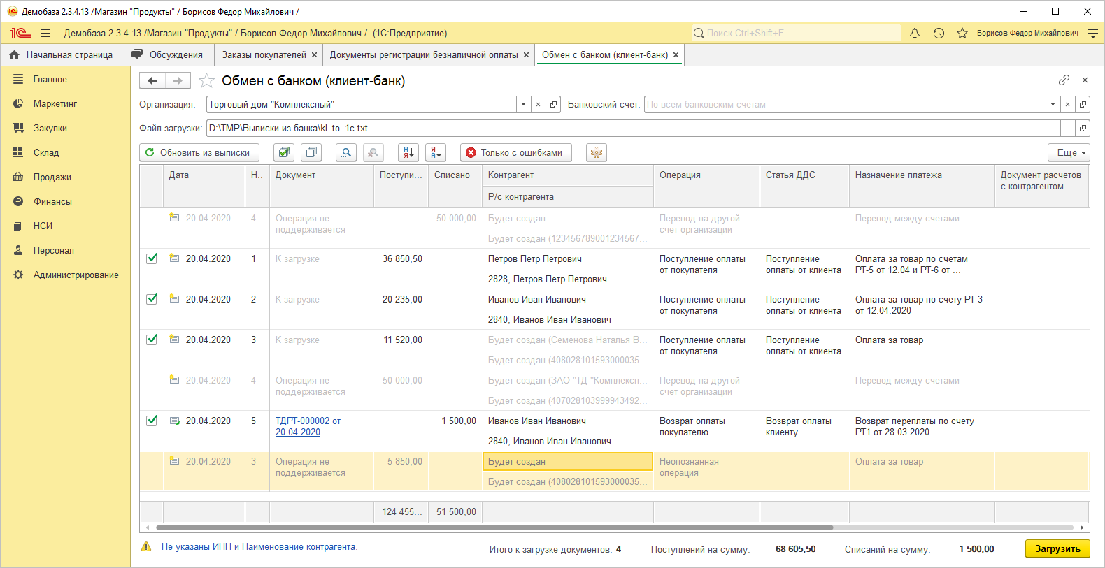 После выполнения команды Загрузить пакетно будут созданы документы вида Регистрация безналичной оплаты.